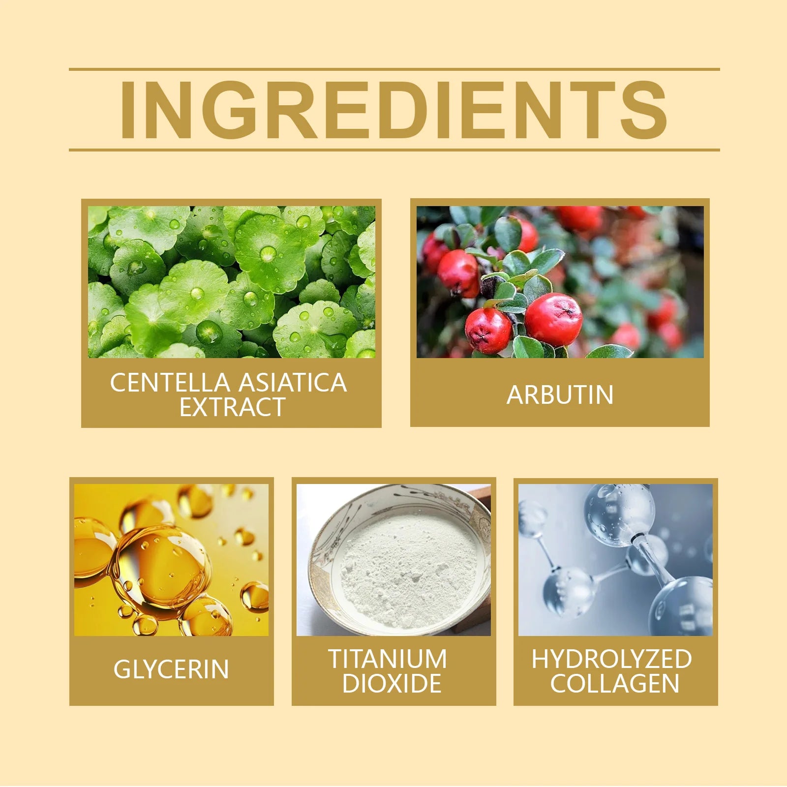 Ingredient: Centella asiatica, arbutin, glycerin